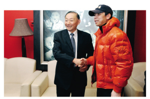 電影《非誠勿擾》昨天也在萬達影城舉行見面會,由此便促成了從未謀面的梅葆玖先生與馮小剛導演的初次見面,而兩人的見面禮則頗有些“火藥味”:馮小剛送上《非誠勿擾》的原聲碟,梅先生則送給對方自己的京劇唱片。不過,兩人一見面就以一個握手化解了賀歲檔這兩部片子的“暗戰”,馮小剛還以電影《梅蘭芳》中的京劇精神來為兩部影片的票房大戰開解:“兩部電影完全不同,但都是好電影,就像京劇里除了梅派也有別的派別,‘不分流派 不分類別’。”