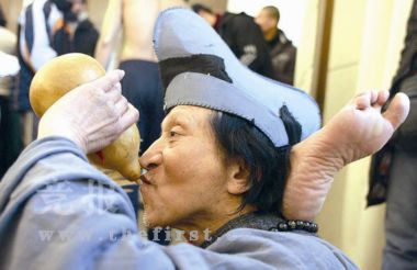 在演員較為集中的一個(gè)大會(huì)議室中,一個(gè)赤膊的青年男子在往身上涂金黃色的顏料,化妝師在給姑娘們卷頭發(fā)。角落的地面上,“濟(jì)公”旁若無人,一手拿著扇子,一手拿著葫蘆,腳后跟枕在腦后,似乎在練“柔術(shù)”。