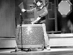向紅櫻束女子打擊樂團的鼓手“討教”后,周杰倫上臺演練擊鼓。