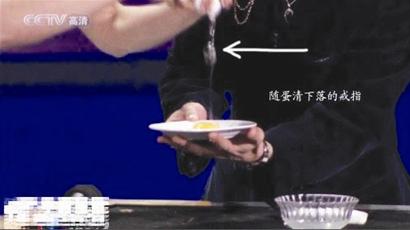 圖七,好了,這一動作做完后,劉謙用左手接過董卿的戒指把玩一番,并問董卿這枚戒指有多貴,這一過程,劉謙很自然地把戒指放到了右手,注意,是塞到了右手的食指和拇指中間,因?yàn)橛沂值氖持负湍粗钢虚g已經(jīng)捏著個被皮筋拉扯的掛鉤,塞進(jìn)戒指后他用左手扭動著戒指,好像在做下意識的動作,其實(shí),是把戒指環(huán)掛到那個掛鉤上,這一動作是在右手的食指和拇指“捏合”之中完成的,觀眾是看不到的,由于角度的原因,觀眾也看不到那根細(xì)細(xì)的皮筋。