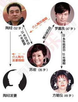 蘇巖和羅嘉良的結婚,用那個落后保守的詞來說,是兩個第三者的婚姻。蘇巖曾是中國電影第一錄音師陶經的妻子,愛情源頭還是張藝謀的《活著》。蘇巖甘當陶經婚姻第三者,歷經十多年終于結婚,而羅嘉良這次又介入了蘇巖的上一次婚姻。一直有猜測說蘇巖是導致羅嘉良與發妻離婚的第三者,其實不是,反倒是羅嘉良讓蘇巖下決心離婚的。現在兩人還在北京買了豪宅,羅嘉良正式落戶內地了。