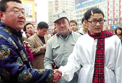 “‘范偉’在二七廣場‘忽魷燒烤’,還引來了‘李云龍’和‘小沈陽’光顧。”3月21日,二七塔前,這3個山寨明星組成了“反山寨聯盟鐵三角”。