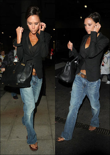 當(dāng)天的維多利亞·貝克漢姆身穿黑色西裝外套,里面則是搭配了黑色露臍抹胸,下面穿了肥大的牛仔褲,小編驚奇的發(fā)現(xiàn),維多利亞居然當(dāng)天沒有穿高跟鞋,而是換了平底的拖鞋,很是少見,難道貝嫂轉(zhuǎn)性啦??? 但是連高跟鞋都可以脫掉的貝嫂絕對不變的就是那張黑臉了。