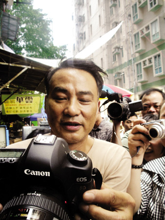 昨天的拍攝地點叫永利街。那是很窄的一條街道,其中一邊已經改造成了高樓,另一邊則保留了一些舊樓。劇組在舊樓這邊搭了些鐵架和舊式廣告招牌,營造上世紀60年代的氣氛。導演羅啟銳介紹:“這條街是香港最后一條60年代老街了,本來已經要拆掉,但是政府為了關照我們,特意推遲到我們拍完再拆。我們用這條街來重現當年的深水埗。”高樓大廈的存在有時挺影響拍攝,“經常穿幫,要靠后期特效來消除”。據說,導演小時候就住在這里。