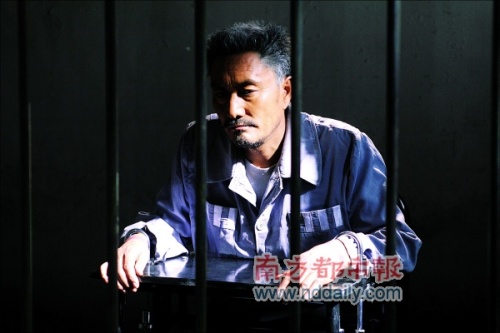 當(dāng)日的內(nèi)景拍攝現(xiàn)場是一間不足20平方米的小屋,整間小屋被布置成監(jiān)獄會(huì)見室的樣子。一道監(jiān)獄的鐵閘將小屋一分為二,鐵閘外是一張小桌,上面放著一杯沖好的茶水和一沓文件,這是律師徐崢會(huì)見犯人時(shí)所用的桌子。鐵閘里只放著一張輪椅,穿著囚服的多布杰就坐在這張輪椅上與徐崢談話。多布杰的左腿整個(gè)小腿部分由支架支撐,據(jù)說,這是一條已經(jīng)被鋸過的假腿。整個(gè)囚室都籠罩在一片發(fā)藍(lán)的光線里,微塵在光里飛舞,有冷感。