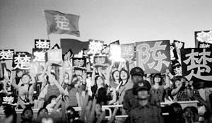 久未露面的陳楚生讓現場歌迷激動不已,分布在看臺上各個角落的上百位“花生”始終舉著“陳楚生”、“楚”的牌子,并且喊著整齊的口號,為陳楚生助陣。