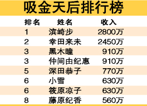 日本一家雜志最近公布“女藝人年收入排行榜”,樂壇天后濱崎步險勝同門賺2450萬元(人民幣)的師妹幸田來未,以2800萬重登榜首,吸金力驚人!