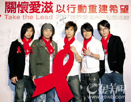搖滾樂團五月天前天來到臺北101為2007世界艾滋病日點燈活動獻唱,并與臺灣知名棒球選手王建民一起點亮臺北101外墻上的紅絲帶,與世界同步關懷艾滋病患者,傳遞愛心。 (晨曉)