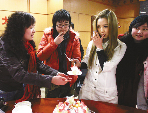 自超女比賽結(jié)束后,何潔的話題新聞就源源不斷:頒獎(jiǎng)禮上摔倒、跪著接受采訪、機(jī)場(chǎng)昏倒、出車禍……儼然成了“話題女王”。昨日下午,她作客本報(bào)與山城“盒飯”歡聚一堂,坦然表示歡迎大家問(wèn)“負(fù)面新聞”,還親手為“盒飯”切蛋糕。