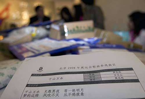 中新網3月12日電 據北京奧運會官方網站消息,昨天是第四屆北京2008年奧運會歌曲征集評選活動截止的日子,也成為眾多名家和普通百姓提交自己作品的高潮。記者下午在北京2008年奧運會歌曲征集辦公室看到,僅僅今天收到的作品已經堆積如山,而這里的工作人員正忙于整理剛剛收到的作品。在這些作品當中,記者赫然發現了“周杰倫”、“林夕”、“方文山”、“小柯”等熟悉的名字。