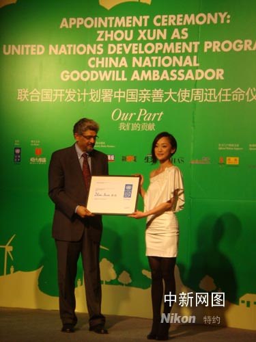 藝人周迅當選首位聯合國開發計劃署中國親善大使