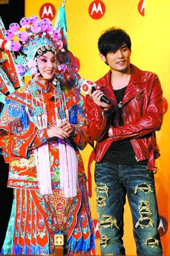 由周杰倫代言的摩托羅拉推出新款手機,不僅請到周杰倫,而且還邀請了京劇演員、變臉演員等進行表演。其中一名扮演“穆桂英”的女演員表示自己是周杰倫的“粉絲”,而周杰倫也饒有興趣的向這位京劇演員學唱“穆桂英掛帥”當中的經典選段,還表示想借“穆桂英”的行頭來穿穿。最后,周杰倫和“穆桂英”不僅共同演唱了改了詞的京劇,還一起用京劇的唱法合唱了周杰倫的名曲《千里之外》。對京劇流露出濃厚興趣的周杰倫聲稱:“我考慮在我的演唱會中加入京劇的元素。要是上萬人一起合唱京劇,實在是很酷。”