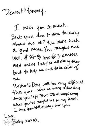無法要求肥姐再做“母親節”專訪,所以《明報》轉托欣宜把肥姐的愛延續下去,記者寫到,當欣宜靜靜地在寫給媽咪的信時,我看她的眼淚一直在流,心里真的好痛,就因一個病,把一對相依為命的母女永遠分開了,欣宜就要一個人地走下去,看到她這封信寫著“親愛的媽咪,我好掛念你,但你不用掛心我,你是一位好母親,教導我好好成長,有好多愛我的姨姨與叔叔,他們都盡心盡力照顧我。今年的母親節對我來說非常之不同,就如你已離開我的每一天一樣,不過我永遠都記得你教我的一切,你永遠都在我心里面。我愛你!一直一直的愛你!Baby(肥姐對欣宜的昵稱)”