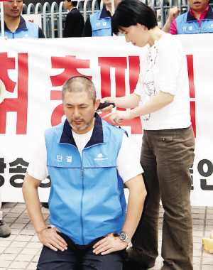 擁有大量歌手、演員的韓國(guó)廣播電影演出藝人工會(huì)(簡(jiǎn)稱藝人工會(huì))昨天10時(shí)在文化放送電視臺(tái)(MBC)門前舉行游行示威,逾300名工作人員舉牌要求MBC就員工薪水問題做出確切回應(yīng),藝人工會(huì)委員長(zhǎng)金應(yīng)錫更跪地削發(fā)表決心,誓要討回公道。