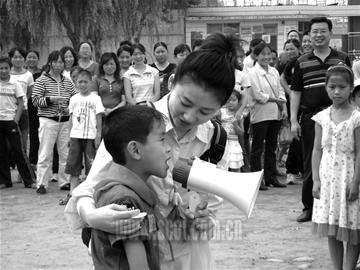 6月1日一早,央視節目主持人王小丫出現在地震災區彭州市慶興小學的操場上,與災區孩子們一起慶祝“六一兒童節”的畫面。王小丫胸前戴著一張“有希望就有未來”的愛心卡,教災區孩子們畫笑臉,和孩子們疊紙飛機、唱歌、做游戲,還給孩子們做心理輔導。