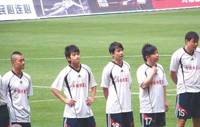 “中國明星足球隊VS好男兒足球隊公益對抗賽”日前在上海開戰,蘇醒作為中國明星足球隊的代表參賽并獻唱了他為抗震救災原創的歌曲《我們在一起》。(記者王大鳴)