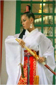 看到這張照片的網民紛紛指出:“雖說這款服裝是以韓國女戰士為主題設計的,但看上去帶有濃郁的日本風。服裝讓人聯想起和服,發型也是日本武士風格。”