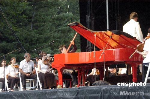 當地時間7月15日晚,中國青年鋼琴家郎朗首次在紐約中央公園音樂會獻藝,他與紐約愛樂樂團合作,演繹了柴科夫斯基第一號鋼琴協奏曲。郎朗宣布現場演奏用的斯坦威限量版鋼琴將在網絡拍賣,所得款項全部用于支援中國四川地震災區重建。中新社發 李靜 攝