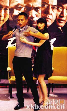 除了增重,劉燁還要犧牲色相。片花中他有一個(gè)背部全裸的鏡頭,劉燁說那個(gè)屁股真的是他的。而他和女主角還有一場(chǎng)在浴室里擁抱的戲。女主角劉洋說,因?yàn)閯钅菚r(shí)候很大只,所以她兩只手還抱不過來,但現(xiàn)在就很容易一下子抱過來了。主持人趁勢(shì)就要求她現(xiàn)場(chǎng)示范一下,劉洋果然就從背后對(duì)劉燁“深情擁抱”,引來現(xiàn)場(chǎng)閃光燈一片。