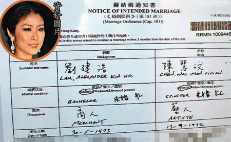 中新網9月17日電 香港媒體報道,陳慧琳(Kelly)和未婚夫劉建浩(Alex)拍拖16年,終于結束愛情長跑,兩人將于下月2日拉埋天窗,并于洲際酒店筵開55席宴請親朋。昨日在金鐘婚姻登記事務及紀錄辦事處,張貼了Kelly和Alex的擬結婚通知書,當中寫上Kelly的真名“陳慧汶”及她身份證原用的英文名“Vivian”,而原來Alex的英文全名是“Alexander”,不過多年來外界已習慣簡稱他做“Alex”。通知書上也列出Kelly和Alex的出生日期,Kelly是72年9月,而Alex則是73年5月,Alex比Kelly差不多小一年。