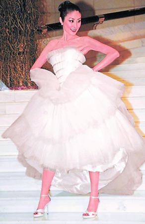 是奚仲文在上環Designer Bridal發現的,他表示,“張叔平為劉嘉玲在Joyce買婚紗時發現很多現成婚紗店,因為時間很趕,上環這間又進口很多現成的國際品牌婚紗,kelly一穿上便很合身很有型,但這婚紗不夠夸張,kelly就用作送客時穿上。”