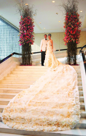 奚仲文說,“kelly想有一套比較夸張的婚紗給記者拍照,碰巧Lusan Mandongus工場肯人手趕制一件,構思是配合洲際酒店的長云石樓梯。頭紗從英國訂過來,長15米左右;婚紗布料則從法國運過來,從最初的12米改成6米多。最初鋪了上千朵牡丹,但鐘珍說999朵好意頭,這衫足足做了一個多月。”