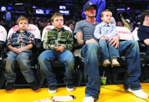 前日,貝克漢姆和湯姆·克魯斯(靚湯)兩家人感恩節(jié)后再度帶著他們的全部?jī)号睹妗ln湯和小貝顯露出了他們做父親的不同方式。貝克漢姆(上圖)帶兒子去看NBA,抱著2歲的克魯茲,旁邊坐著6歲的羅密歐和9歲的布魯克林。