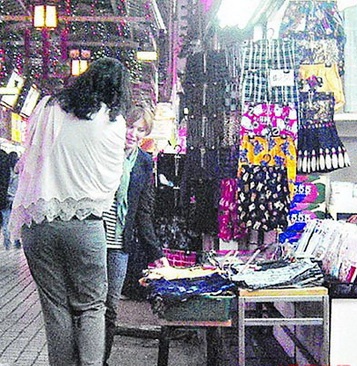 凱莉·米洛(右)在男性四角褲攤位前駐足端詳。