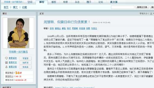 宋祖德在博客里面寫道,他是從自己下屬某公司獲得該內幕的,除了知道他們是在炒作外,還獲悉倪震已經負債500萬港幣。并炮轟倪震借鑒“伊能靜與庾澄慶婚變事件”策劃出這一起分手復合戲,其意是在保持周慧敏的關注度,以便提高周慧敏的演唱會票房牟利。田雯