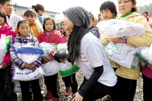 翁虹與丈夫是“中國社工協會(兒童希望)救助”的形象大使。上周,他們與志愿者們一起將棉衣、棉被等過冬物資送到四川省綿陽市一些災民手中,并提前跟孩子們過年。