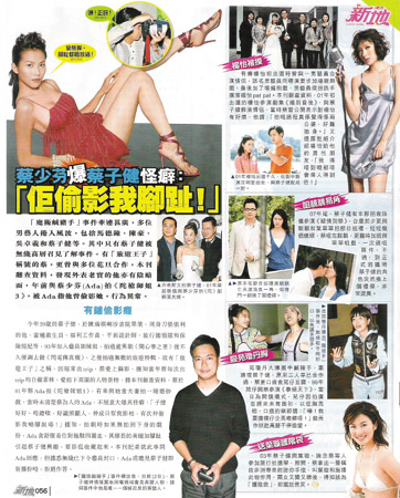 今年39歲的蔡子健,進入演藝圈之前曾當過救生員、福利工作者、平面設計師、旅行團領隊和保險經紀等,1993年加入無線藝員訓練班,拍完情景劇《開心華之里》后不久便被調去主持《閃電傳真機》節目,之后拍過無數旅游特輯,故有“旅游王子”之稱。因經常出差,他愛上攝影。據資料顯示,2001年,蔡子健與蔡少芬合拍《陀槍師姐3》時,兩人演夫妻拍一場婚紗戲。當時蔡少芬不經意地大爆蔡子健的怪癖:“子健人不錯,很懂得照顧人,還整天幫我照相,有一次還偷拍我的腳趾!”據知,拍劇時,蔡少芬經常貪舒服穿著拖鞋到處走,其修長的美腿和腳趾引起蔡子健的興趣,所以拍下來作收藏。近日,記者就此事詢問蔡少芬,但據悉無線已下令藝員“封口”,蔡少芬對關于蔡子健的問題立即裝聾扮啞,拒絕作答。