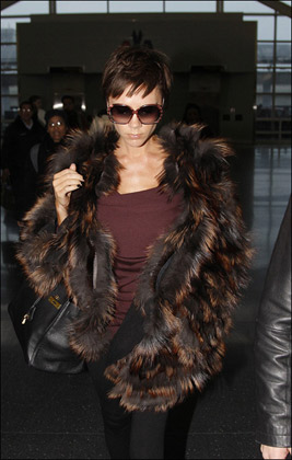 剛剛結束了阿瑪尼第五大道開業(yè)典禮活動的維多利亞·貝克漢姆又馬不停蹄的換回了雷人的裝扮,摘掉了藍色的發(fā)卡,換上了皮草大衣,這次的衣服毫無貴婦裝扮可言,遠遠看去就像是一只被火燒到毛的火雞,實在是雷人不淺,唯一值得一提的還是黑面上的那副墨鏡,還是蠻好看的。
