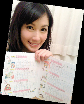 李詩韻從小就在加拿大讀書,雖然回香港做了5年的演藝工作,已經能看懂70%的中文,但是會寫的漢字不足200個,平時寫博客也需要麻煩同事幫忙。從她博客上的圖片可以看到,練習冊上歪歪斜斜地寫著“門”、“房”、“橋”等字,目前只相當于一年級學生的水平。