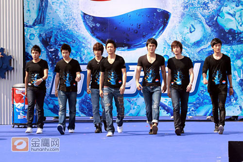新加盟成員SJ-M先聲奪人,如古代騎士般在塔樓尖上出現(xiàn)的他們立刻引起了在場(chǎng)歌迷的陣陣尖叫。而后古天樂(lè)、蔡依林、李準(zhǔn)基、羅志祥、黃曉明在印有該品牌標(biāo)識(shí)的大卡車(chē)頂緩緩出現(xiàn),12位成員當(dāng)場(chǎng)在臺(tái)上互相潑水取樂(lè),宛如畫(huà)面。