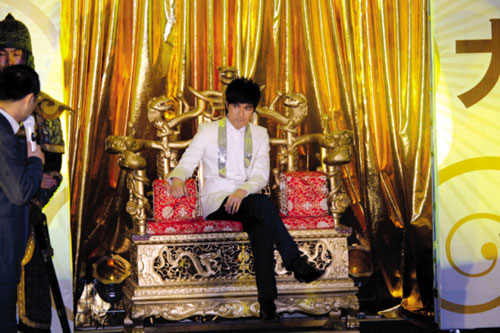 “登基大典”上,8位身著古裝的“將軍”以拉開卷軸的方式,一條條列舉出古巨基曾拿下“TVB最受歡迎男歌手”、“央視最受歡迎電視劇男主角”、“曾推出大碟35張,總銷量過900萬張”等過往佳績,身著白色西裝的古巨基坐著特制的“龍椅”出現(xiàn)在舞臺中央,架勢十足。不過古巨基一開口便搞笑:“這張龍椅讓我想起了《還珠格格》。我篡位了?”