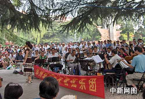 鄭州市碧沙崗公園,是為紀(jì)念北伐戰(zhàn)爭(zhēng)的烈士而修建的,而今成為人們休閑的主要場(chǎng)所。在這里,有一個(gè)民間組織——“鄭州碧沙民族管弦樂團(tuán)”,不僅頗具規(guī)模,而且水平也很專業(yè),演職人員全是來自民間。“兩株巨松當(dāng)戲棚,樹下平地做舞臺(tái)”,圍觀的人們既是觀眾又是演員。