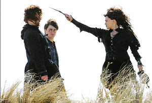 《哈利·波特》系列電影的第七部——《哈利·波特與死亡圣器》,目前正在英國彭布魯克郡熱拍。扮演女魔頭貝拉特里克斯的英國女演員海倫娜·邦漢·卡特出現在了片場,這個在第五集《哈利·波特與鳳凰社》開始登場的壞蛋,難得出現在外景中,她將與哈利三人組進行更激烈的對抗。在拍片現場,“哈利”丹尼爾·雷德格里夫和“赫敏”艾瑪·沃森也都高調亮相。