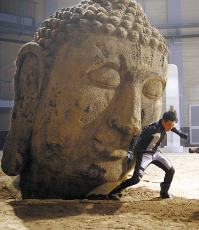 在《未來警察》中,劉德華化身為正義的未來警察,跟大S、范冰冰、徐嬌、樊少皇、賀軍翔共同上演了一出時空穿梭、正邪激戰的火爆好戲。片中有一幕,拍的是劉德華站在一尊兩米高的石佛之下,與樊少皇率領的改造人團伙激烈打斗。據了解,一貫追求完美的劉德華當時堅持不用替身,結果意外發生了。雖然已事先備下保護措施,但在推動佛像的過程中,這座千余斤的巨物卻突然失控,將劉德華壓在下面,F場工作人員大驚失色,一擁而上解救他,但畫面也因此穿幫。 (李麗)
