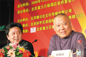日前,“2009郭德綱圣誕喜樂會”發布會在北京舉行。郭德綱今年選擇了富力萬麗酒店,將在可容納1000人的宴會大廳里說相聲。對于最高8800元、最低1800元的高價票設定是否合理,郭德綱直言真正的“綱絲”10萬元也舍得花,這說明相聲市場繁榮了。