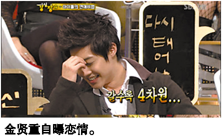 金賢重自出道以來都沒有傳出過任何緋聞,因此這次他自曝與女藝人的戀情,在節目錄制現場就引起了很大的反響。而在節目播出后,還有不少粉絲到節目的官方網站發表留言,紛紛猜測這名與金賢重交往過的女藝人究竟是誰。 (南安宇)