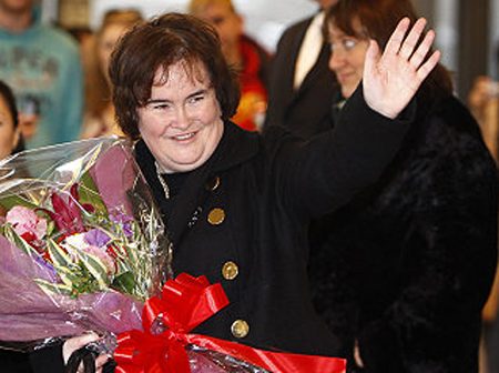 中新網12月30日電 英國當紅明星蘇珊大媽(Susan Boyle)昨天(29日)抵達日本,她將參加日本放送協會(NHK)在除夕夜舉辦的紅白歌唱大賽。蘇珊大媽上午抵達東京成田機場,現身出境口時,滿臉笑容更狂向粉絲送飛吻,她已愈來愈有明星架勢。