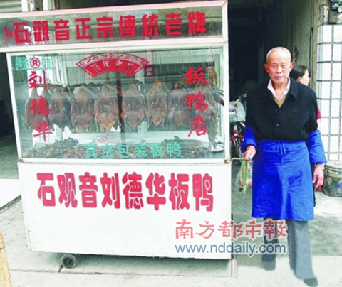 據悉,觀勝鎮賣板鴨的有幾十家,每一家多用店主名字注冊作為招牌。而劉老伯在1980年已創立以自己姓名命名的板鴨店,2004年申請“劉德華牌板鴨”注冊成商標,2007年申請成功。