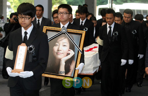 “朝鮮日報(bào)”消息,張真英的兩個(gè)侄子分別手捧牌位和遺像,走在送靈隊(duì)伍最前面。緊隨棺材的母親止不住悲痛的淚水,讓人感到心痛。遺屬和安在旭、車太賢、金亞中等圈內(nèi)好友及參加遺體告別儀式的親朋好友也在送靈隊(duì)伍之中。