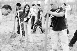 幾十位演員又是刨坑,又是澆水,雖然在劇中一個個都是“英雄好漢”,但面對小小樹苗卻沒了脾氣。對植樹一點不在行的他們,樹還沒植幾棵,就已經累得大汗淋漓,有的人手上磨出了水泡,有的人手背被樹枝剮破。