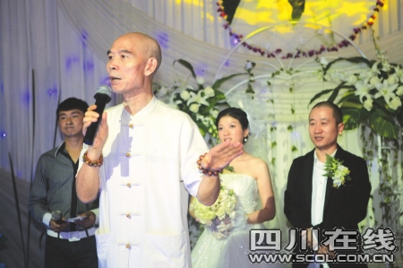 “我今天來主婚,是對李保田神往已久。李彧作為大明星李保田的兒子,偏偏來到四川找媳婦,找到了咱們南充姑娘陳燕琳,真是千里姻緣一線牽,這就是緣分!”昨天中午12時,南充東方花園賓館熱鬧非凡,著名影星李保田的兒子李彧和22歲的陳燕琳的盛大婚禮在這里舉行,近些年來極少拋頭露面的著名散打評書藝術家李伯清高調亮相,為新郎新娘主婚。李保田因拍戲沒有到場,陳燕琳的父母以及從北京遠道而來的李彧的媽媽、妹妹參加了婚禮,四川名導陳福黔與廖健、叮當、林曉冬、熊藝彬等《王保長新篇》劇組等10多位巴蜀笑星也到場慶賀。婚禮結束后,新娘陳燕琳接受本報記者在現場的采訪,她聲稱,絕不會靠明星爸爸李保田去混娛樂圈。