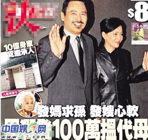 昨日有香港媒體報道,年屆九旬的發(fā)媽陳麗芳希望發(fā)哥能夠找代孕,為周家添后,一圓20多年的夙愿,同時也為周潤發(fā)10億元的家產(chǎn)“制造”繼承人。據(jù)知,有人提出以一百萬元代價,在內(nèi)地尋覓優(yōu)質(zhì)代母,務(wù)求一擊即中。