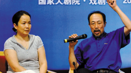 最激動的是飾演主角“培爾”的孫海英,打扮隨意的他剛拿起話筒時語調(diào)十分平靜,還被一旁的老伴呂麗萍調(diào)侃“說話像領(lǐng)導(dǎo)”。但談到演《培爾·金特》的感受,他的語調(diào)頓時激動起來,更大嘆“話劇已死”:“現(xiàn)在的戲劇都是在作假,互相說假話。人們都太浮躁,明明看不懂我們這部戲,只是看個熱鬧,到半場就回家了,還愣說看得懂———你明白個屁呀!什么都不明白!藝術(shù)不是因為你懂才來的,是因為不懂才來的,看不懂你就得學(xué)!我們不需要迎合大眾,你愛來不來。”