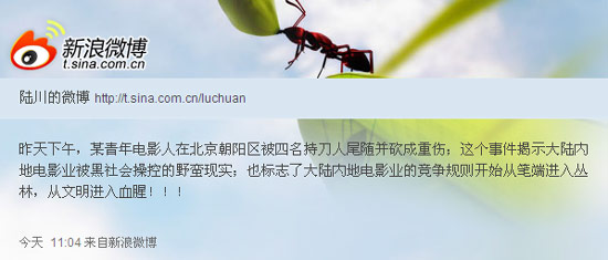 9日上午11時04分,導演陸川在微博稱:“昨天下午,某青年電影人在北京朝陽區被四名持刀人尾隨并砍成重傷!标懘ㄟ在微博中分析,懷疑此事和某些黑勢力有關。他還表示:“這個事件標志了大陸內地電影業的競爭規則開始從筆端進入叢林,從文明進入血腥!!”