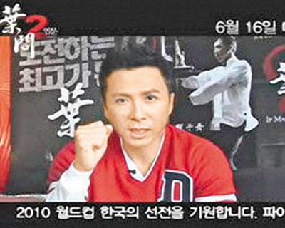 臺灣《中國時報》消息稱,《葉問2》遠征韓國,甄子丹正在拍《關云長》無法前往,因此錄了約2分鐘的短片向韓國觀眾問好。他以韓文打招呼,接著說:“韓國是亞洲足球強國,希望韓國隊在本屆世界杯有優秀表現。”他還說自己是曼聯隊韓國選手樸智星的球迷。