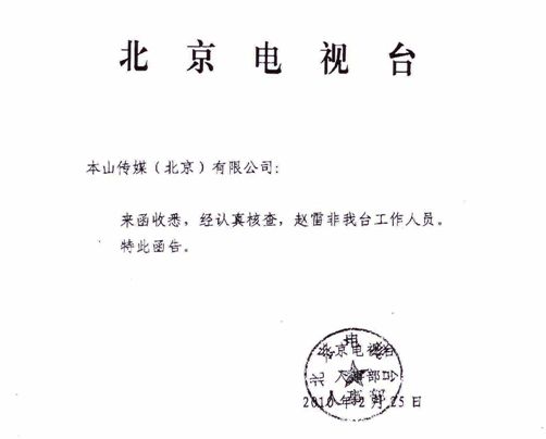 近日,在網上出現了一條消息,作者自稱是北京電視臺導演趙雷。消息稱趙本山在央視春晚演完《捐助》后,因為小沈陽有兩個廣告包袱沒抖出來,在后臺打了小沈陽兩記耳光。對此,本山傳媒鄭重聲明,這條消息純屬捏造。另外,本山傳媒已致函北京電視臺人事部,了解趙雷的身份。北京電視臺人事部回函聲明,趙雷不是北京電視臺工作人員。